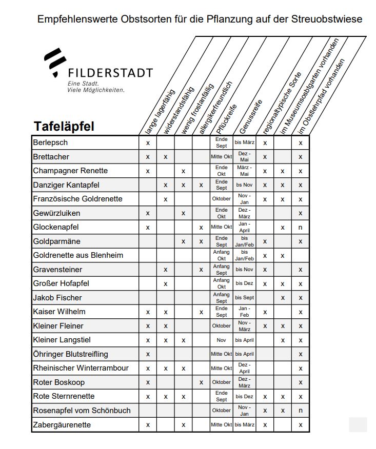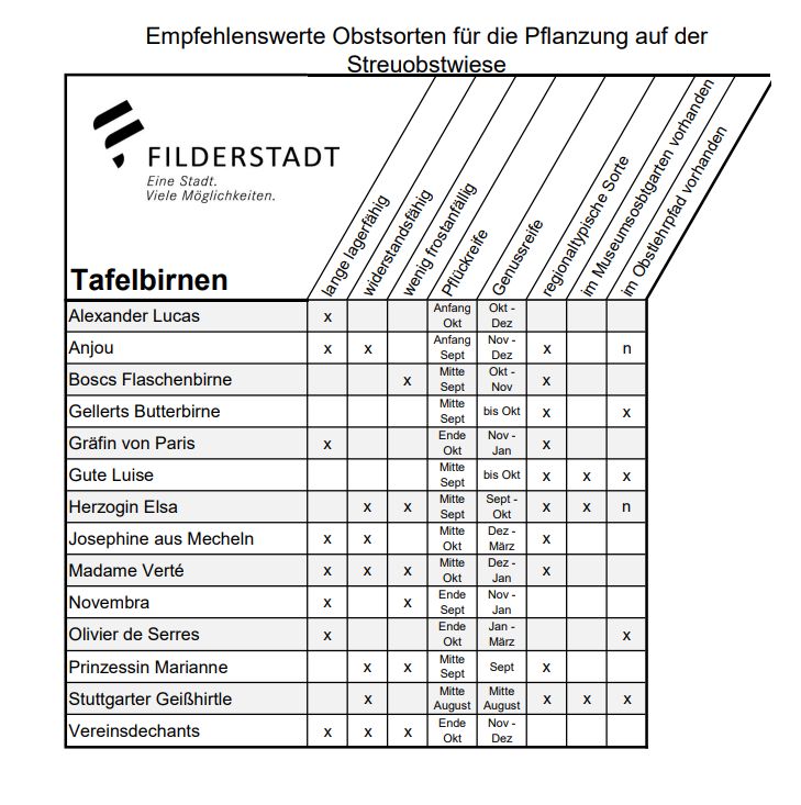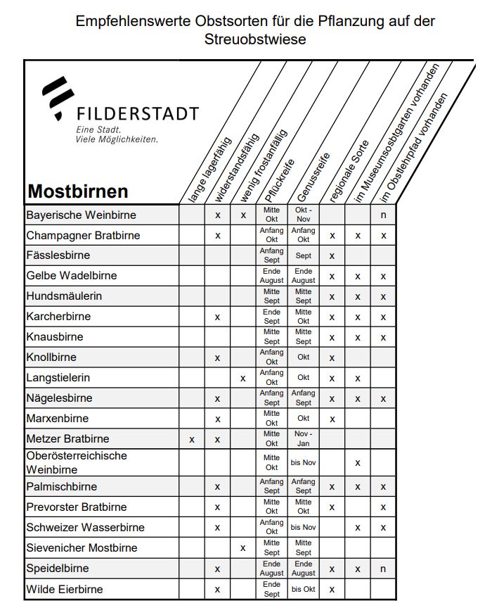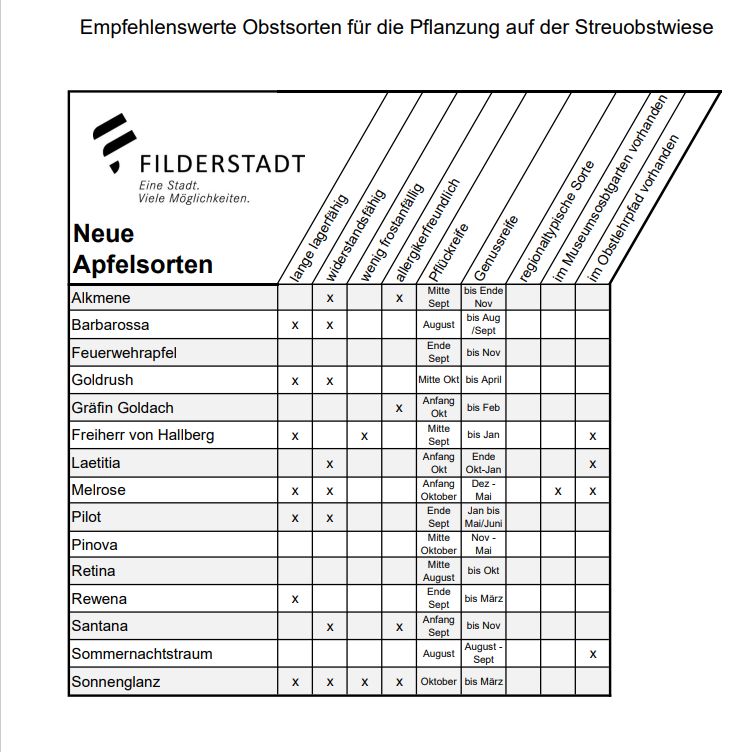 Eine Auswahl an geeigneten Sorten für den Streuobstanbau in Filderstadt finden Sie hier. Zum Herunterladen der PDF-Dateien klicken Sie bitte die gewünschte Obstart an.